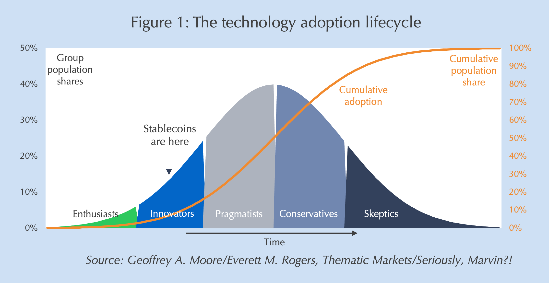 Pragmatists, too, are driven by cost concerns by need evidence of a practical business case. That can come from a critical mass of users created by innovators, regulatory endorsement, or cost declines or productivity gains driven by both. But it also comes from peer validation: adoption quickens as more users embrace the technology. All those ingredients now are in place and create a virtuous circle of rising stablecoin use: official sanction and regulation by the US government raises trust in stablecoins as a means of payment, rising trust begets increased usage, which both increases use and further reduces costs, raising trust and usage further, and so on.