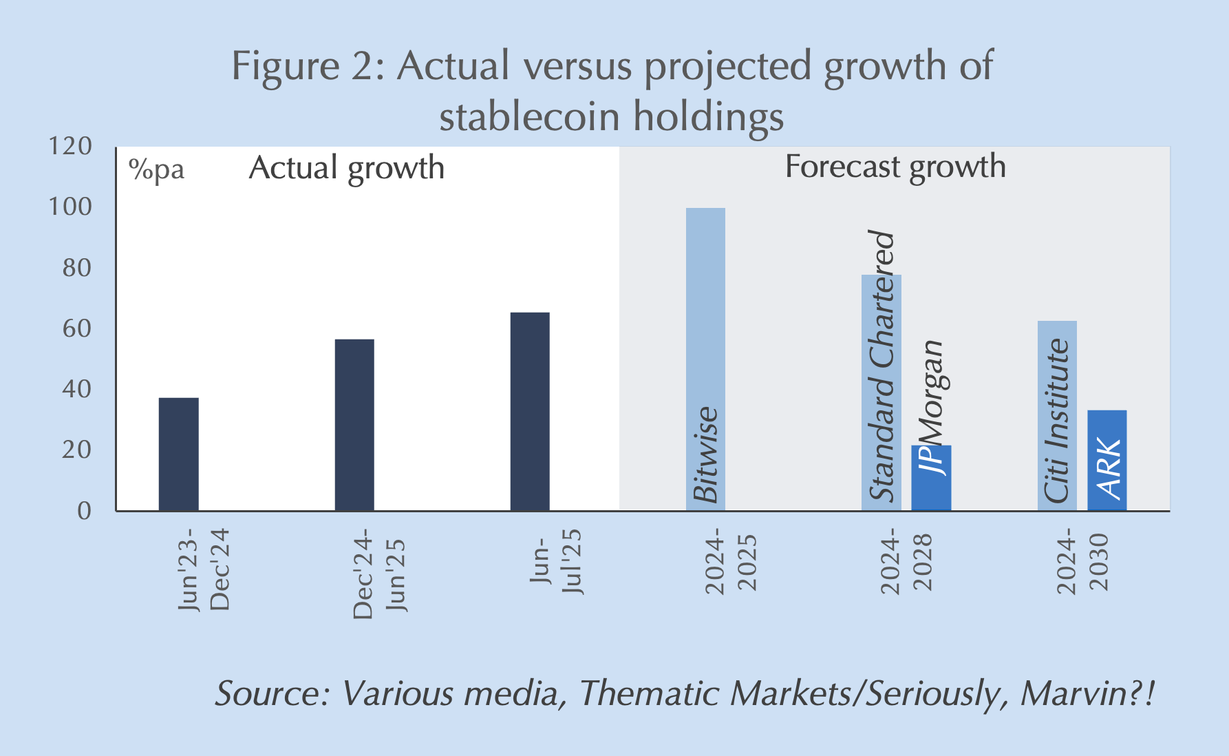 While the orange line in Figure 1 is a figurative representation of cumulative adoption rates, it accurately represents the observed pattern of technological adoption: a logistical function that initially grows slowly before exploding exponentially and finally slowing again as full adoption nears.1010 The shift to exponential growth begins with adoption by innovators and accelerates in the handoff to pragmatists. While one could argue how far we are through the “innovators” phase, it’s difficult to argue that stablecoin adoption won’t accelerate markedly given already-in-place infrastructure and the regulatory boost from the GENIUS Act. Yet, most market forecasts of stablecoin holdings over the next three to five years show a deceleration in growth (Figure 2).