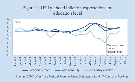 These stories may seem farcical fodder for tabloid covers and TikTok memes, but I expect them to have significant political and market consequences. If that seems far-fetched, recall that earlier this year I forecast that the Trump Administration’s non-release of the “Epstein files” risked reigniting inflationby undermining his voters’ faith in his ability to bring down inflation.66 Yet, as is often the case with my predictions – you have subscribed, haven’t you? – exactly that happened as shown by the jump in lower-education consumers’ inflation expectations shown in Figure 1 (note that their expectations had moved in the opposite direction to educated consumers who were more likely to vote for former Vice President Harris). Sometimes, things that seem inconsequential to the cognoscenti become totems for the masses.