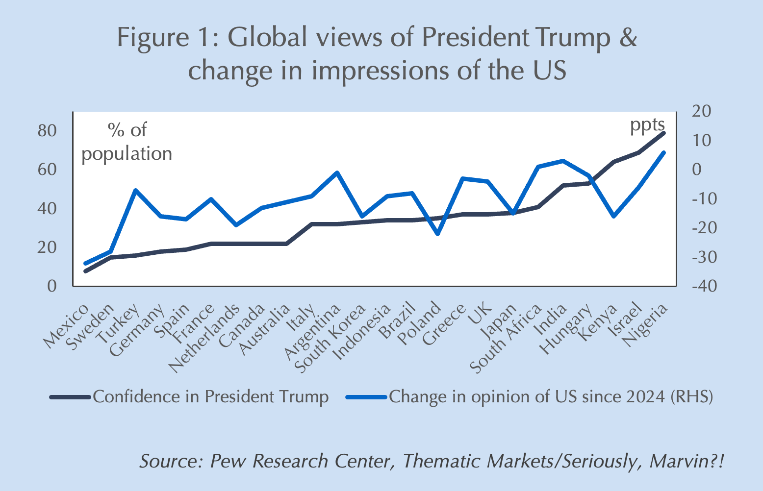 Conversely, many elites – especially bureaucrats – in countries with high approval of President Trump, intensely dislike both him and his policies. This may reflect their incentives: across economies, the greatest beneficiaries of both globalization and the “rules-based order” have been the elites that write those rules, manage international institutions, and are best positioned to manipulate both to their own advantage. President Trump’s populism and policies threaten their livelihoods and sources of power. That might well explain why approval rates for Mr. Trump in Figure 1 appear to be correlated with country income inequality: the fewer and more powerful the elites, the greater the share of the population approving of his policies.