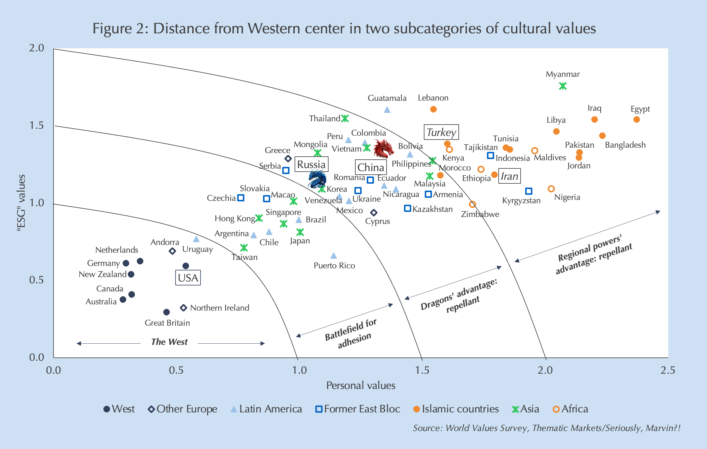 In Global entropy: Enter the dragons (free at Thematic Markets), I describe how the West’s strategic rivals in China, Russia and Iran have exploited both cultural differences and the West’s stubborn denial of them to hasten the PWLO’s demise. I refer readers to that (very long) article for details, but Figure 2 reproduces one of its main analyses. Based on responses of 94,000 interviewees to the 259 questions in the World Values Survey, I calculated the mathematical distance of the 107 surveyed countries’ values from the average Western nation along two axes: Personal values related to family, the role of women, sexuality, and religion; and quasi-ESG (environment and social governance) values of individual freedom, tolerance and environmentalism. Contrary to a central tenant of the PWLO, most countries of the world have very different values to the West. Interestingly, even the leading Western nation, America, is quite culturally different to the average of its Western allies.