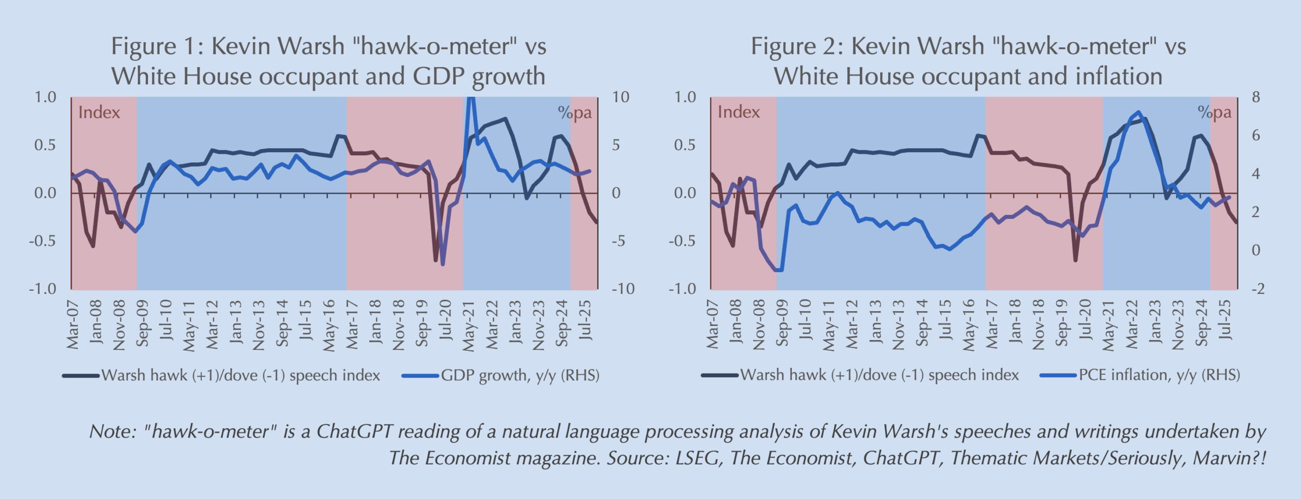 Both Paul Krugman,1[1] whose ability to twist economic theory into a pretzel to fit his politics could shame a German baker, and The Economist2[2] used large language models to construct “hawk-o-meters” from Mr. Warsh’s speeches and writings that neatly (appears) to fit changes in White House occupants. That is until you compare the indices to economic variables like GDP growth (Figure 1) or inflation (Figure 2) that seem to much better explain Mr. Warsh’s vacillations than moving vans coming and going from 1600 Pennsylvania Avenue.3[3]