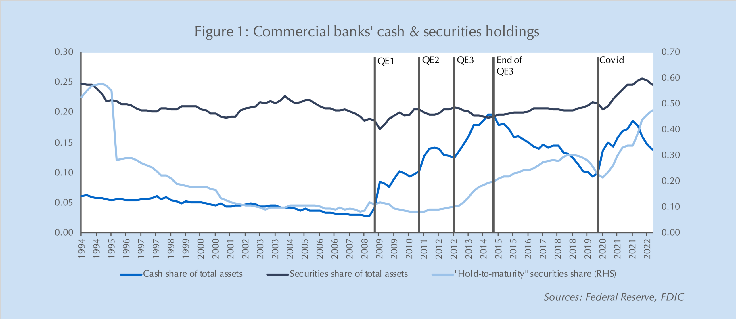 While credit risk is harder to observe in aggregate data, we can clearly see the effects of QE on banks’ asset composition and interest rate risk. Figure 1 shows US-chartered commercial banks’ reserves and securities (bond) holdings as a share of total assets. The reserve share increased markedly during the three rounds of post-GFC QE and during the post-Covid QE program. The securities share increased much more during the latter. Also displayed, against the right axis, is the “hold-to-maturity” share of securities; or bonds that banks, for accounting purposes, commit to hold until they mature. This is an indirect measure of banks’ willingness to take interest rate risk.
