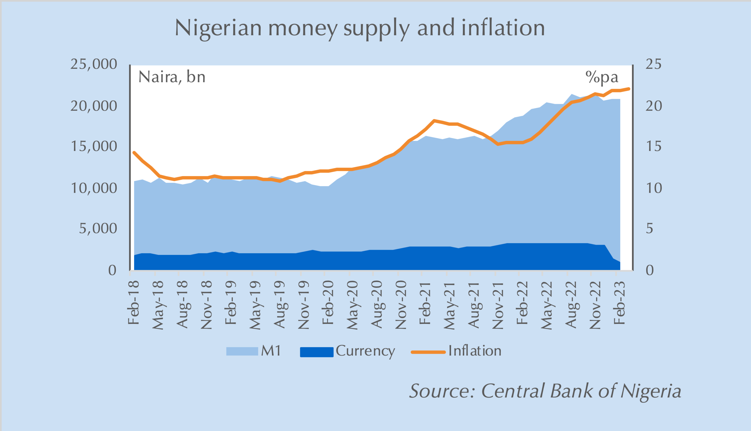 In Nigeria, this effect was so powerful that the collapse in currency crimped economic activity rather than curtail inflation.  As shown in the chart below, inflation has continued to accelerate in Nigeria – to a multi-decade high of 22% in March – even as currency in circulation collapsed.  Instead, it appears that retail trade has fallen by an estimated 3%,22 reflecting the “quantity theory of money” that for a given fall in the money supply either inflation or output must fall, or the turnover (velocity) of money must rise.  In Nigeria’s case, inflation expectations would not allow inflation to fall, so output and velocity had to adjust instead.