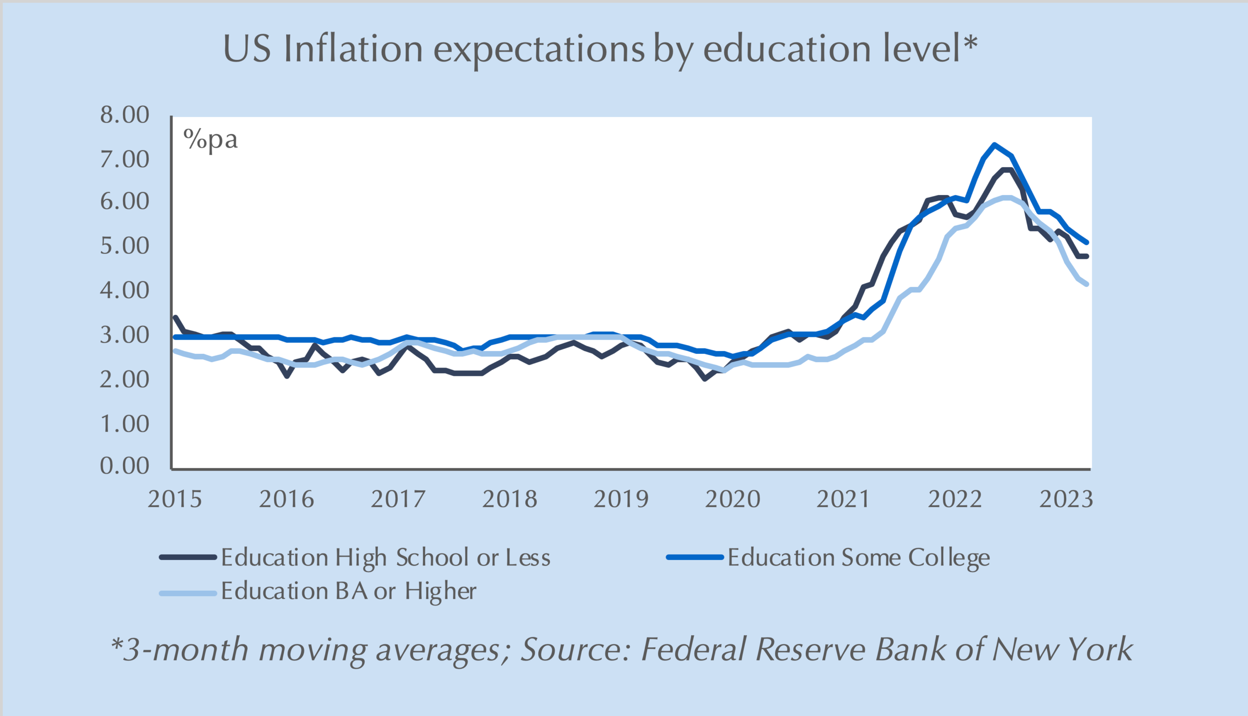 What does this have to do with inflation in the US, UK, and other economies experiencing higher than usual inflation?  Readers of Thematic Markets will know the critical role that inflation expectations – Being is believing effects – have played in the shift higher in advanced economy inflation since 2021.  Yet, despite consistent evidence from the University of Michigan and New York Fed surveys of consumers that inflation expectations (second chart) are not falling – particularly among the lower-education consumer that led its rise in late 2020 – markets (wrongly in my view) price a rapid return to 2% inflation in the US by next year.  Nigeria is not an advanced economy, but human nature and the power of believes is quite constant across societies; economic analysts and markets might do well to heed the lessons Nigeria is illustrating.