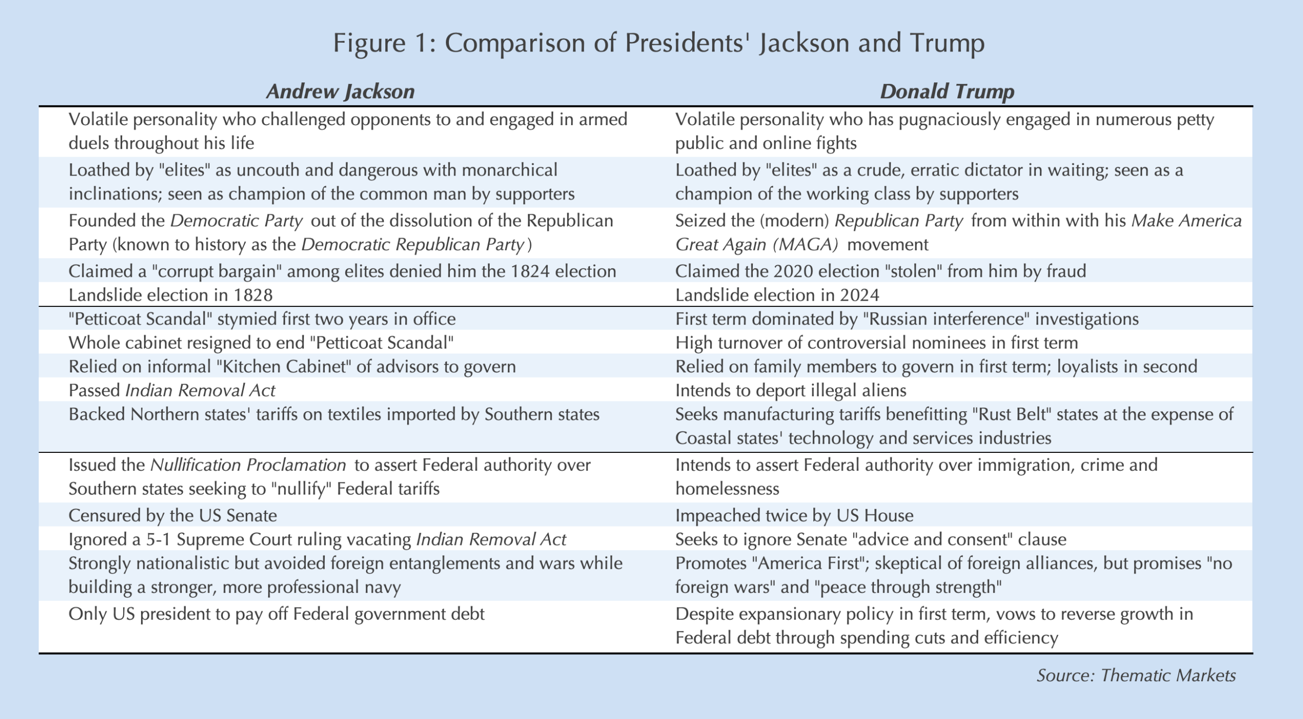 The parallels between the rhetoric, policies and temperaments of Trump and Jackson are uncanny and are listed in Figure 1. If history doesn’t repeat, the history of the Jackson Administration weirdly rhymes with US political history since 2016. Andrew Jackson won a resounding popular election in 1828, campaigning on a platform of government reform after what he called a “corrupt bargain” among the elites denied him victory in the 1824 election. The first two years of his presidency were stymied by the Petticoat Scandal, precipitated by elites that rejected both he and his Secretary of War, and which resulted in the resignation of his full cabinet. He passed the 1830 Indian Removal Act authorizing the expulsion of Native Americans from lands east of the Mississippi River and ignored a 5-1 majority of the Supreme Court striking it down. His populist battle to kill the Second Bank of the United States was a success but earned him the only censure of a president by the Senate. His backing of a controversial tariff policy provoked the Nullification Crisis when Southern states claimed the right to ignore them. Despite his strong advocacy for states’ rights, Jackson asserted Federal authority, preserving the union for another three decades until the Civil War. Jackson avoided both foreign entanglements and wars as president, while reforming, professionalizing and expanding the US Navy. President Jackson was also the only US president to completely pay off the Federal debt.