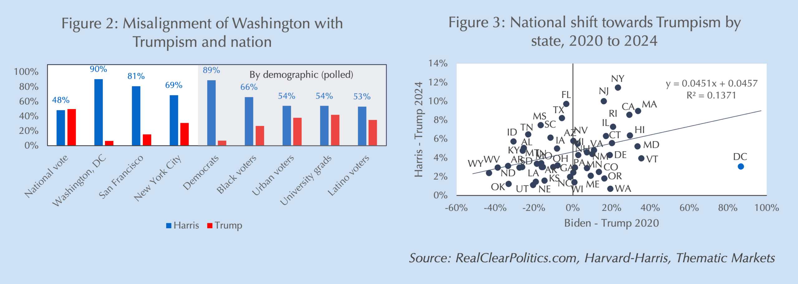 One does not need to be a ”deep-state” conspiracy theorist to see that the Federal bureaucracy is more opposed to President Trump and his agenda than any other group. Figure 2 shows how far out of alignment with the rest of America the Federal employees, contractors and the citizens economically dependent on the Federal bureaucracy are. While President Trump beat Vice President Harris in the popular vote 50% to 48%, District of Columbia residents voted 90% to 7% for Ms. Harris. Washington’s anti-Trump vote stands out relative to even famously progressive cities like San Francisco or New York, or to the voting intentions of strongly Democratic demographics and even self-identified Democrats.